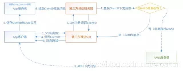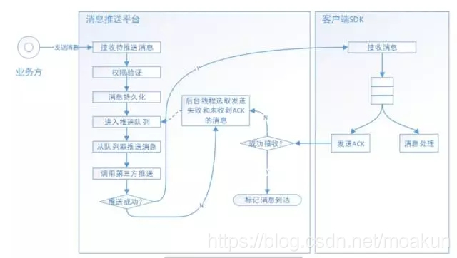 消息推送涉及的主要模块是消息推送平台和客户端 SDK,主要流程如下图所示: