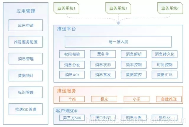 整个系统设计由三部分组成:移动推送平台、客户端 SDK、应用管理界面(第三方推送服务和自建推送服务统称为推送服务)。