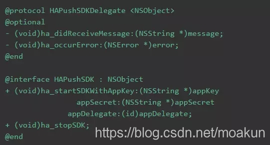 SDK 提供启动和停止的方法;同时定义一个 protocol,包含 SDK 提供的接口。SDK 在收到消息或出现错误时将会回调 protocol 中的接口。