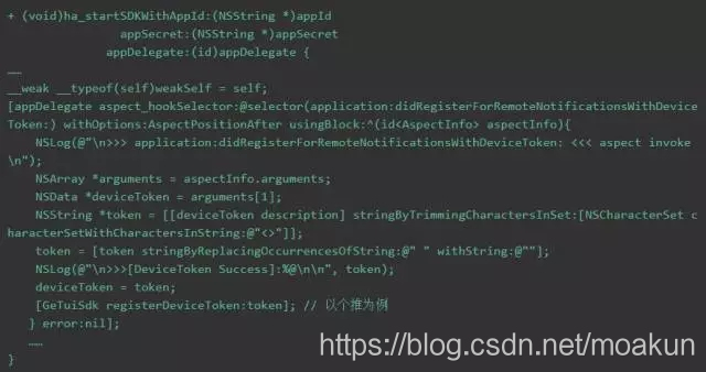 由于推送的接入涉及 AppDelegate 的生命周期方法,为避免 SDK 使用者关注这些繁琐的细节,SDK 使用 Aspects 的方式,将推送时相应的处理函数 hook 到 AppDelegate 的生命周期方法上。