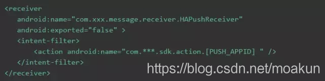 流程如下:当推送服务的 SDK 在接收到推送过来的消息后,将发送广播,这个广播的用 intent-filter 标识,当应用中的 Receiver 代码注册了这个 intent-filter,就可以接收到广播,并进行后续处理。