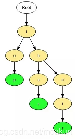 这些单词以顶部到底部的方式存储,其中绿色节点“p”,“s”和“r”分别表示“top”,“thus”和“theirs”的底部。