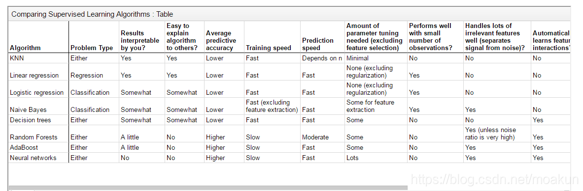 在监督式学习下,输入数据被称为“训练数据”,每组训练数据有一个明确的标识或结果,如对防垃圾邮件系统中“垃圾邮件”“非垃圾邮件”,对手写数字识别中的“1“,”2“,”3“,”4“等。在建立预测模型的时候,监督式学习建立一个学习过程,将预测结果与“训练数据”的实际结果进行比较,不断的调整预测模型,直到模型的预测结果达到一个预期的准确率。监督式学习的常见应用场景如分类问题和回归问题。常见监督式学习算法有决策树(ID3,C4.5算法等),朴素贝叶斯分类器,最小二乘法,逻辑回归(Logistic Regression),支持向量机(SVM),K最近邻算法(KNN,K-NearestNeighbor),线性回归(LR,Linear Regreesion),人工神经网络(ANN,Artificial Neural Network),集成学习以及反向传递神经网络(Back Propagation Neural Network)等等。下图是几种监督式学习算法的比较: