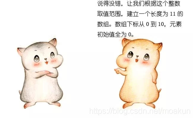 非常简单,让我们遍历这个无序的随机数列,每一个整数按照其值对号入座,对应数组下标的元素进行加1操作。