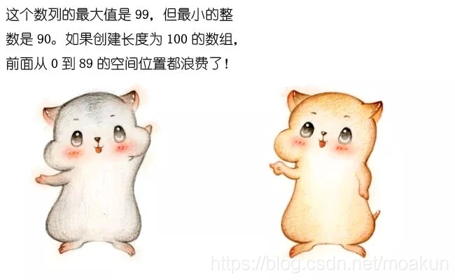 以刚才的数列为例,统计数组的长度为 99-90+1 = 10 ,偏移量等于数列的最小值 90 。