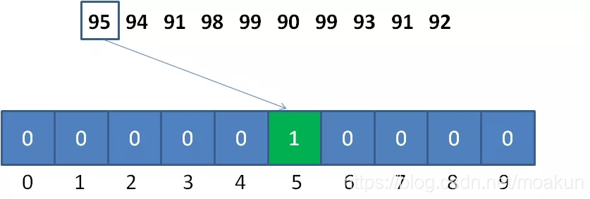 对于第一个整数95,对应的统计数组下标是 95-90 = 5,如图所示: