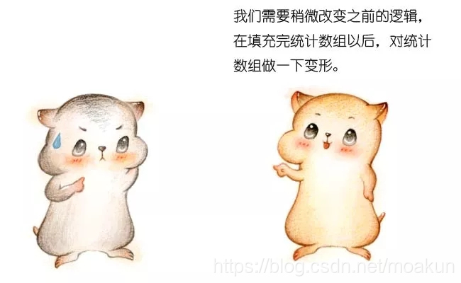 下面的讲解会有一些烧脑,请大家扶稳坐好。我们仍然以刚才的学生成绩表为例,把之前的统计数组变形成下面的样子: