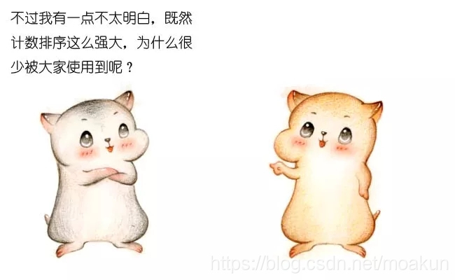 比如给定20个随机整数,范围在0到1亿之间,这时候如果使用计数排序,需要创建长度1亿的数组。不但严重浪费空间,而且时间复杂度也随之升高。