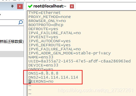 (2)接着找到如下命令对应位置(我这里是ens33),设置DNS1=8.8.8.8,最后重启网络service network restart 即可。