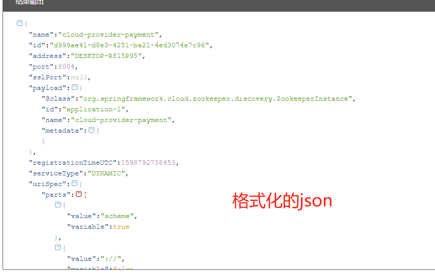 {"name":"cloud-provider-payment","id":"d999ae41-d8e3-4251-ba21-4ed3074e7c96","address":"DESKTOP-R815P95","port":8004,"sslPort":null,"payload":{"@class":"org.springframework.cloud.zookeeper.discovery.ZookeeperInstance","id":"application-1","name":"cloud-provider-payment","metadata":{}},"registrationTimeUTC":1598792758453,"serviceType":"DYNAMIC","uriSpec":{"parts":[{"value":"scheme","variable":true},{"value":"://","variable":false},{"value":"address","variable":true},{"value":":","variable":false},{"value":"port","variable":true}]}}