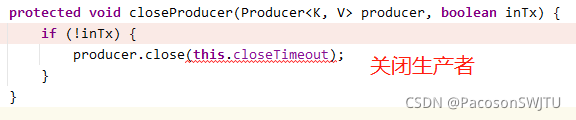 }protected void closeProducer(Producer<K, V> producer, boolean inTx) {if (!inTx) { // 非事务才关闭 producer.close(this.closeTimeout);}