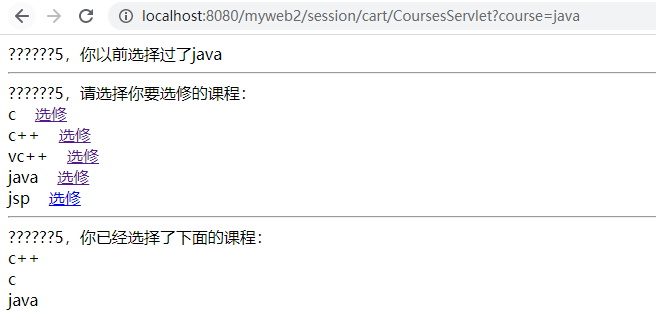 {public void service(HttpServletRequest request,HttpServletResponse response) throws ServletException, IOException{response.setContentType("text/html;charset=gb2312");PrintWriter out = response.getWriter();HttpSession session = request.getSession();String sessionName = (String)session.getAttribute("name");/*如果用户没有登录,sessionName为null,或者上次访问后的空闲时间超过了session的限制,getSession方法返回的是一个新Session对象,sessionName也为null*/if(sessionName == null){/*因为下面是在同一个WEB应用程序内部跳转,最好是采用forward方法进行请求转发,这里仅仅是为了复习sendRedirect方法*/response.sendRedirect("../logon.html");return;}String courseSelect = request.getParameter("course");if(courseSelect != null){Vector vCourses = (Vector)session.getAttribute("courses");if(vCourses == null){vCourses = new Vector();vCourses.add(courseSelect);session.setAttribute("courses",vCourses);}else{if(vCourses.contains(courseSelect)){out.println(sessionName + ",你以前选择过了" + courseSelect + "<hr>");}else{/*vCourses是指向Session中的一个属性对象的引用,对vCourses的操作直接影响那个属性对象,不用再将vCourses重新增加进Session中*/ vCourses.add(courseSelect);}}}String [] courses = {"c","c++","vc++","java","jsp"};out.println(sessionName + ",请选择你要选修的课程:<br>");for(int i=0; i<courses.length; i++){//对参数中的特殊字符应进行URL编码,这里的请求路径是 CourseServlet 自己本身 out.println(courses[i] + " <a href='CoursesServlet?course=" + URLEncoder.encode(courses[i],"gb2312") + "'>选修</a><br>");}out.println("<hr>");Vector vCourses = (Vector)session.getAttribute("courses");out.println(sessionName + ",你已经选择了下面的课程:<br>");if(vCourses != null){for(Enumeration e=vCourses.elements();e.hasMoreElements();){out.println((String)e.nextElement() + "<br>");}}}