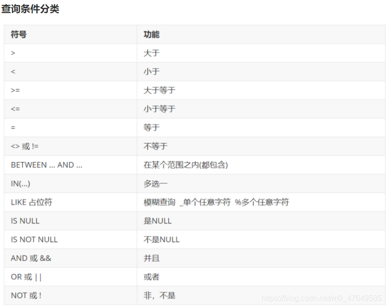 – like模糊查询: where 字段名 like ‘带占位符的字符串’;