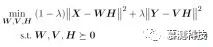 假设有一组 n 个不同的图像,它的特征可以是 m _ n 个图像特征矩阵 X 以及 l _ n 个逐个图像矩阵 Y。我们的基本思想是为图像和文本特征分别找到合适的基数 W 和 V,它们通过一个公共系数矩阵 H 隐式耦合。换句话说,我们的目标是找到两个低秩近似。