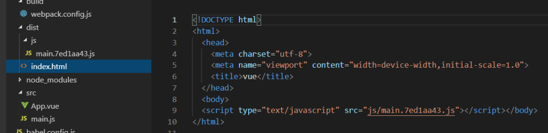 我们发现打包后的文件自动插入了 index.html 模板,并生成了一个新的 index.html 文件,细心的朋友应该看到了所有的文件都合并在 main.js 了,等下我就说说该如何把这个文件分开;在之前我们先看看如何实现开发环境热更新。