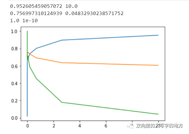 recallall = []aucall = []scoreall = []gamma_range = np.logspace(-10,1,20)for i in gamma_range: clf = clf = SVC(kernel = "rbf" ,gamma=i ,degree = 1 ,cache_size = 3000 ,class_weight = "balanced").fit(Xtrain, Ytrain) result = clf.predict(Xtest) score = clf.score(Xtest,Ytest) recall = recall_score(Ytest, result) auc = roc_auc_score(Ytest,clf.decision_function(Xtest)) recallall.append(recall) aucall.append(auc) scoreall.append(score)print(max(scoreall), gamma_range[scoreall.index(max(scoreall))])print(max(aucall), gamma_range[aucall.index(max(aucall))])print(max(recallall), gamma_range[recallall.index(max(recallall))])plt.plot(gamma_range,scoreall)plt.plot(gamma_range,aucall)plt.plot(gamma_range,recallall)plt.show()返回结果