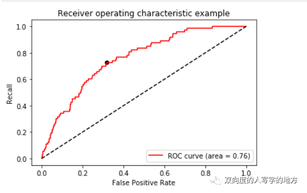 max((recall - FPR).tolist())maxindex = (recall - FPR).tolist().index(max(recall - FPR))plt.figure()plt.plot(FPR, recall, color='red', label='ROC curve (area = %0.2f)' % area)plt.plot([0, 1], [0, 1], color='black', linestyle='--')plt.scatter(FPR[maxindex],recall[maxindex],c="black",s=30)plt.xlim([-0.05, 1.05])plt.ylim([-0.05, 1.05])plt.xlabel('False Positive Rate')plt.ylabel('Recall')plt.title('Receiver operating characteristic example')plt.legend(loc="lower right")plt.show()返回结果