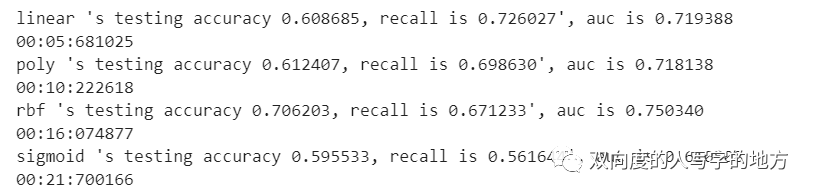 times = time() for kernel in ["linear","poly","rbf","sigmoid"]: clf = SVC(kernel = kernel ,gamma="auto" ,degree = 1 ,cache_size = 3000 ,class_weight = "balanced").fit(Xtrain, Ytrain) result = clf.predict(Xtest) score = clf.score(Xtest,Ytest) recall = recall_score(Ytest, result) auc = roc_auc_score(Ytest,clf.decision_function(Xtest)) print("%s 's testing accuracy %f, recall is %f', auc is %f" % (kernel,score,recall,auc)) print(datetime.datetime.fromtimestamp(time()-times).strftime("%M:%S:%f"))因为训练集中正常公司远远多于非正常公司,所以存在样本不均衡问题。分类模型天生会倾向于多数的类,让多数类更容易被判断正确,少数类被牺牲掉。但是这样对我们的模式是没有意义的,根本无法达到我们的“要识别几年后会处于财务困境的公司”的建模目的。 SVC中class_weight中"balanced"