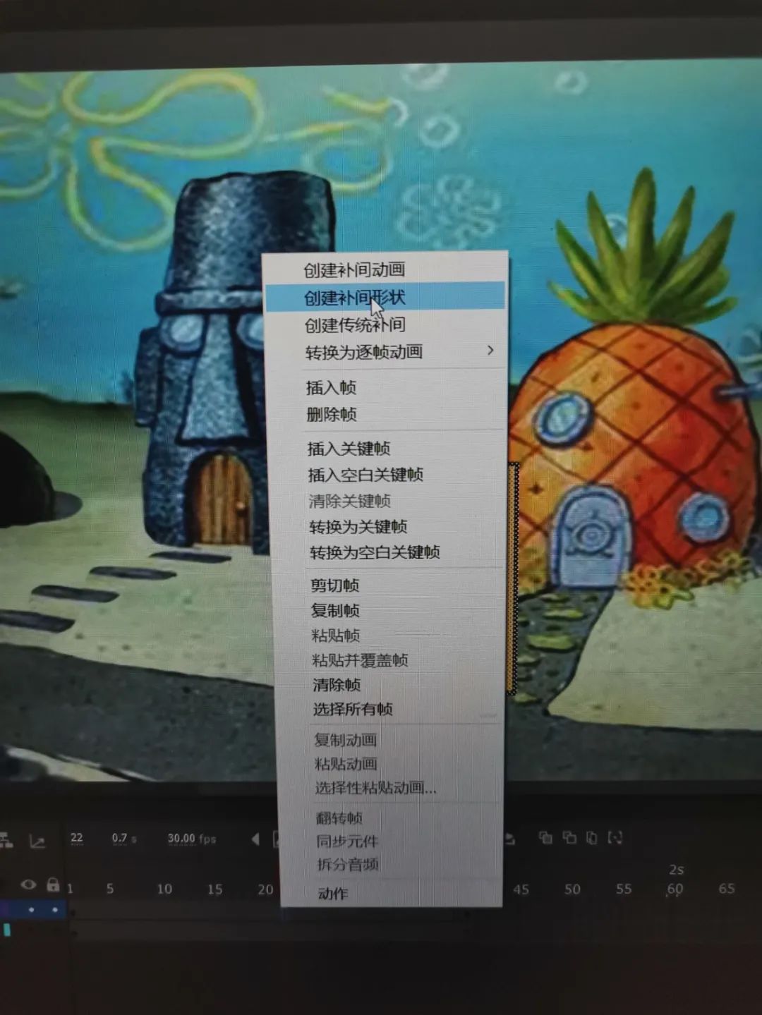 6.在图层2的第一帧至关键帧之间,选中任意一帧创建“补间形状”(点击右键)。