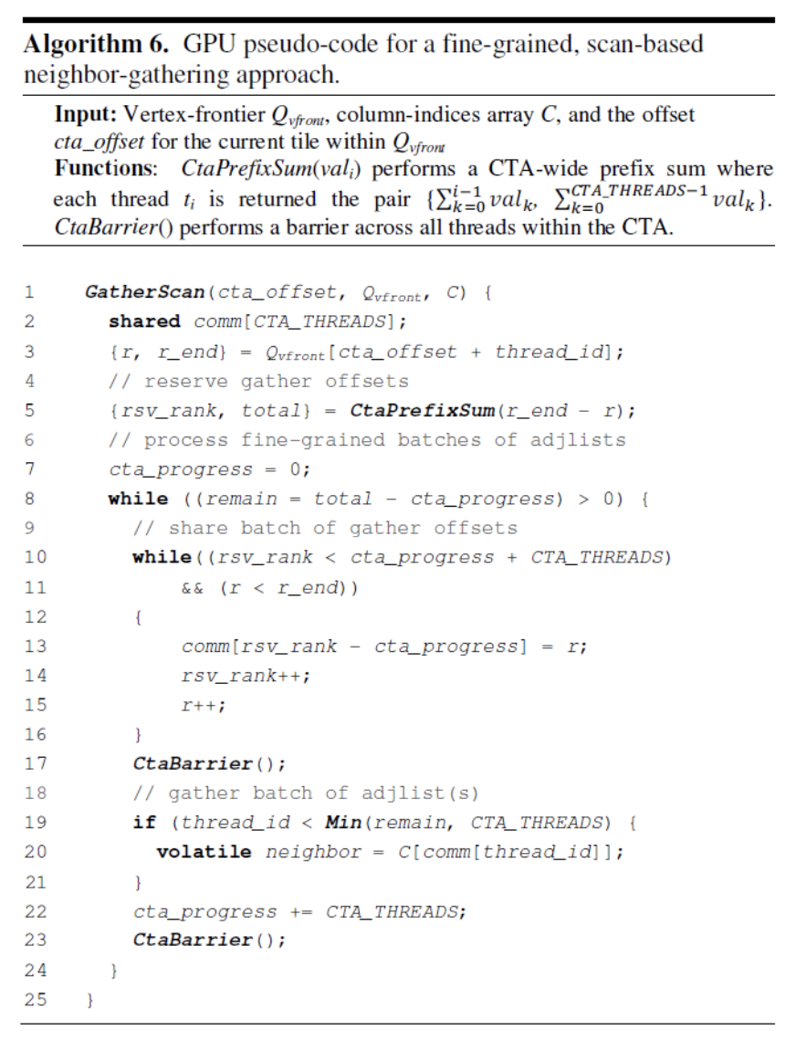 下图算法5中展示了warp协同的方法,warp中的线程竞争warp的控制权,竞争的胜利者将自己的任务广播给warp中所有的线程,大家一起完成该任务,然后重复“竞争-广播-协作”的过程。