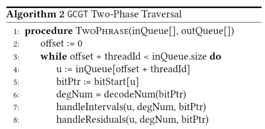算法二中给出了GCGT的实现:所有的线程会先处理intervals然后处理residual,并且一个warp中的所有线程会同时进入处理residuals的阶段。并且处理interval也是分成两步,先处理长度大于32(一个warp的大小)的interval,再处理小于32的。