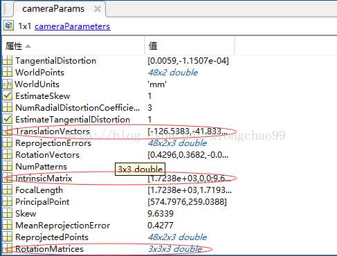 如下图,MATLAB标定得到的红框中依次是外参平移向量、内参矩阵、外参旋转矩阵,它们都需要做转置后才能应用于本文的公式计算: