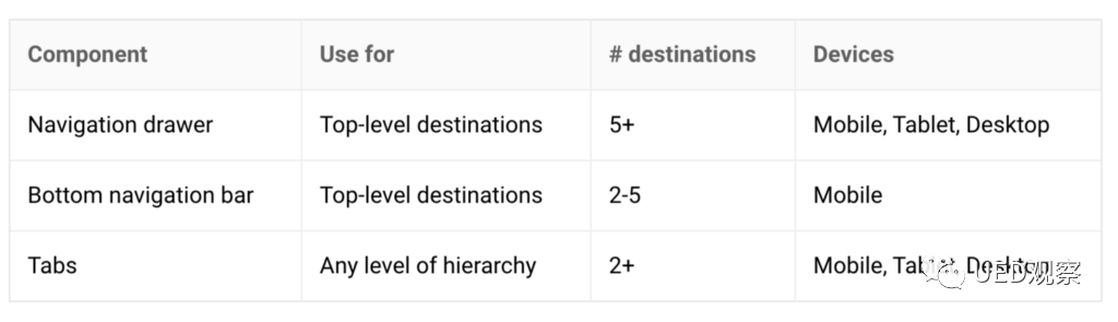 iOS仅建议一种顶级导航方法:Tab栏。Android则有三种方法:导航菜单,底部导航栏和标签。