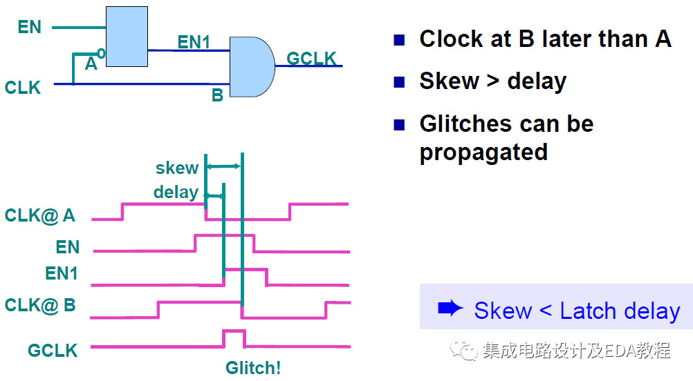 一般插入分离门控时钟单元可能会引起时钟偏斜(Clock Skew)问题,进而会导致输出的时钟信号中有毛刺。