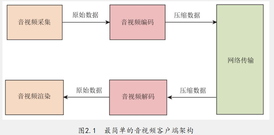 一个最简单的直播客户端至少应该包括音视频采集模块,音视频编码模块,网络传输模块,音视频解码模块和音视频渲染模块五大部分。如下图所示