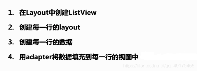 import java.util.List;public class AppListActivity extends AppCompatActivity {@Overrideprotected void onCreate(@Nullable Bundle savedInstanceState) {super.onCreate(savedInstanceState);setContentView(R.layout.activity_app_list);ListView applistview = (ListView)findViewById(R.id.app_list_view);List<String> appNames = new ArrayList<>();appNames.add("QQ");appNames.add("weixin");appNames.add("Sina");applistview.setAdapter(new AppListAdapter(appNames));}//AppListAdapter 设置如下,并需要自己的布局public class AppListAdapter extends BaseAdapter{List<String> mAppNames;public AppListAdapter(List<String> appNames){mAppNames = appNames;}@Overridepublic int getCount() {//有多少条数据return mAppNames.size();}@Overridepublic Object getItem(int position) {//返回获取当前数据位置return mAppNames.get(position);}@Overridepublic long getItemId(int position) {//返回获取当前数据的IDreturn position;}@Overridepublic View getView(int position, View convertView, ViewGroup parent) {//处理VIEW和DATA的适配填充过程//把XML载入JAVALayoutInflater layoutInflater = (LayoutInflater) getSystemService(Context.LAYOUT_INFLATER_SERVICE);//把layout转换成VIEWconvertView = layoutInflater.inflate(R.layout.item_app_list_view,null);ImageView appIconImageView = (ImageView) convertView.findViewById(R.id.icon_image_view);TextView  appNameTextView = (TextView) convertView.findViewById(R.id.app_name_text_view);appNameTextView.setText(mAppNames.get(position));return convertView;}}}