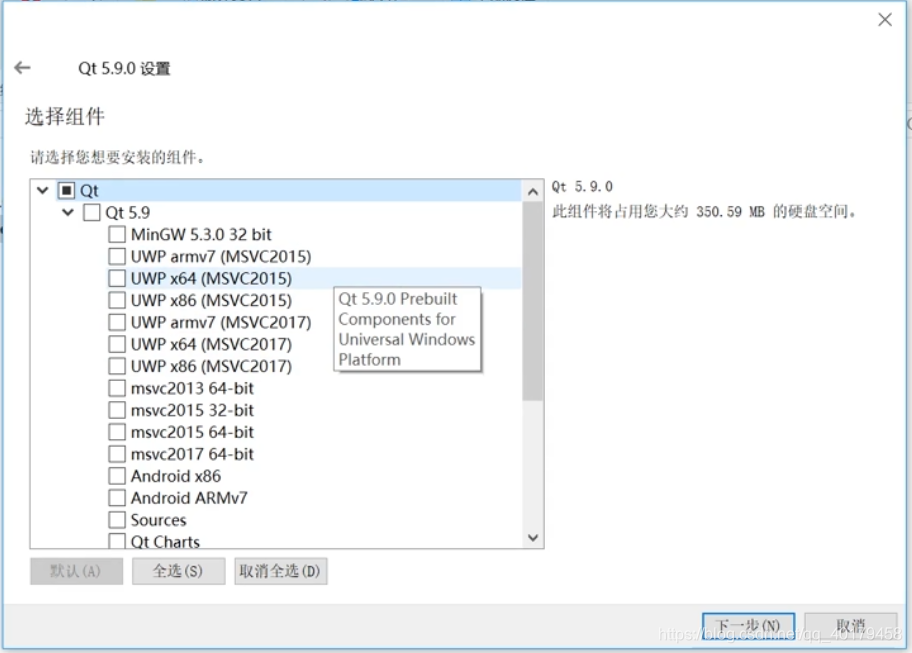 1.安装中根据不同的开发环境勾选相应的,如果使用VS编译请先安装VS和SDK然后再安装QT。