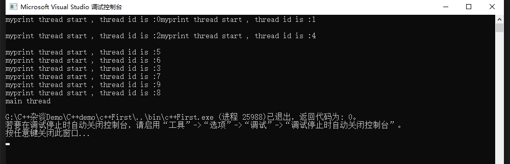 }int main() {//创建和等待多个线程vector<thread>mythread;//创建十个线程for (int i = 0; i < 10; i++){mythread.push_back(thread(myprint, i));//创建并开始执行线程}for (auto ider = mythread.begin(); ider != mythread.end(); ider++){ider->join();}cout << "main thread" << endl;return 0;