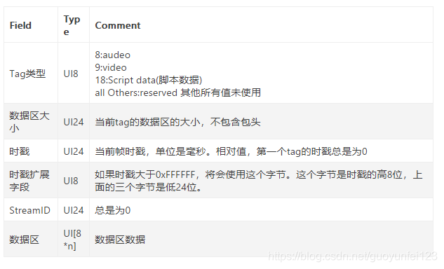 FLV Tag的类型可以是视频、音频和Script(脚本类型),下面分别介绍这三种Tag类型