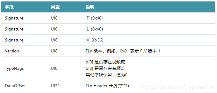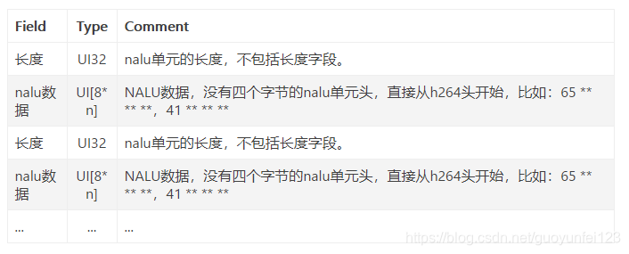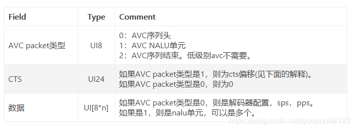 注:在下面的数据type中,UI表示无符号整形,后面跟的数字表示其长度是多少位。比如UI8,表示无法整形,长度一个字节。UI24是三个字节,UI[8*n]表示多个字节。UB表示位域,UB5表示一个字节的5位。可以参考c中的位域结构体。