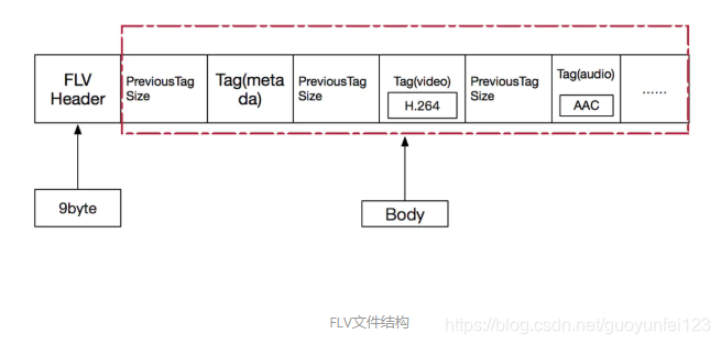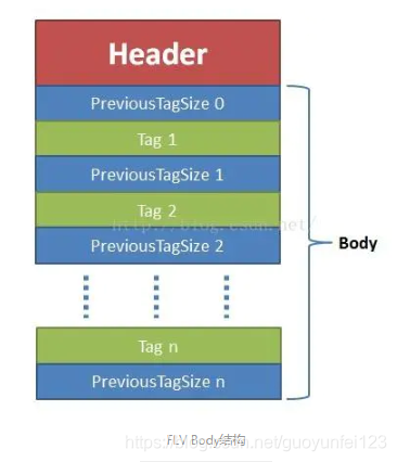 FLV Header之后,就是FLV File Body.FLV File Body是由一连串的back-pointers + tags构成。Back-pointer表示Previous Tag Size(前一个tag的字节数据长度),占4个字节。