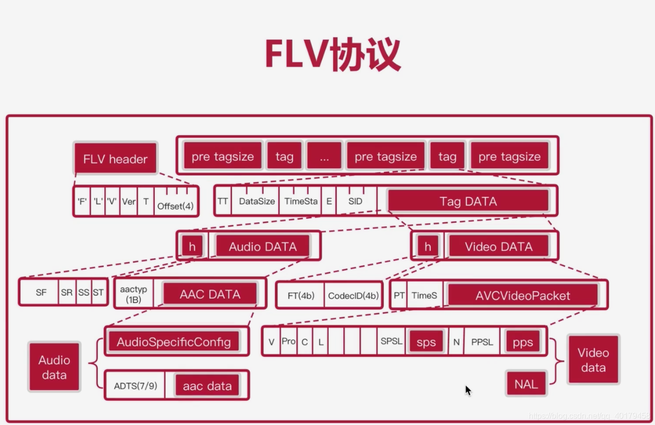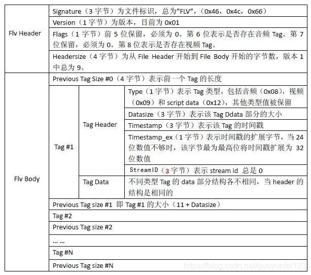 FLV封装格式是由一个文件头(flie header)和 文件体(file Body)组成。其中,FLV body由一对对的(Previous Tag Size字段 + tag)组成。Previous Tag Size字段 排列在Tag之前,占用4个字节。Previous Tag Size记录了前面一个Tag的大小,用于逆向读取处理。FLV header后的第一个Pervious Tag Size的值为0。Tag一般可以分为3种类型:脚本(帧)数据类型、音频数据类型、视频数据。FLV数据以大端序进行存储,在解析时需要注意。一个标准FLV文件结构如下图: