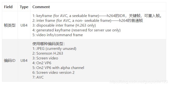 视频Tag Data开始的第一个字节包含视频数据的参数信息,从第二个字节开始为视频流数据。结构如下: