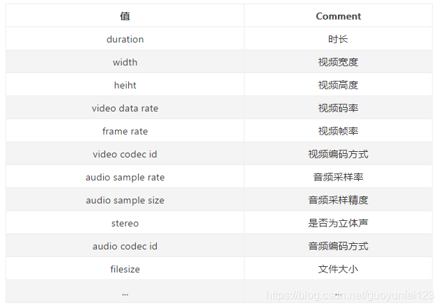 该类型Tag又被称为MetaData Tag,存放一些关于FLV视频和音频的元信息,比如:duration、width、height等。通常该类型Tag会作为FLV文件的第一个tag,并且只有一个,跟在File Header后。该类型Tag DaTa的结构如下所示: