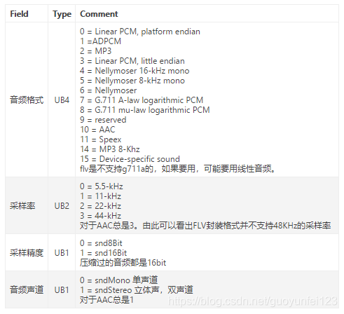 音频Tag Data区域开始的第一个字节包含了音频数据的参数信息,从第二个字节开始为音频流数据。结构如下: