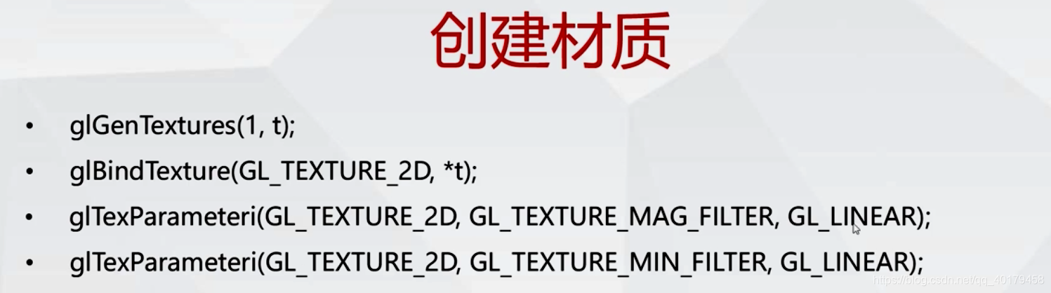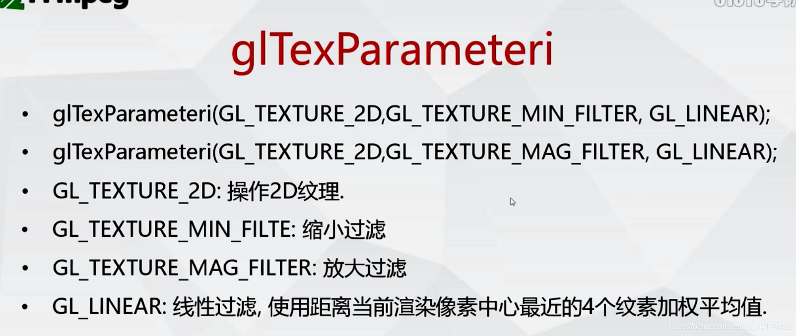 {qDebug() << "initializeGL";//初始化opengl (QOpenGLFunctions继承)函数 initializeOpenGLFunctions();//program加载shader(顶点和片元)脚本//片元(像素)qDebug() << program.addShaderFromSourceCode(QGLShader::Fragment, tString);//顶点shaderqDebug() << program.addShaderFromSourceCode(QGLShader::Vertex, vString);//设置顶点坐标的变量program.bindAttributeLocation("vertexIn", A_VER);//设置材质坐标program.bindAttributeLocation("textureIn", T_VER);//编译shaderqDebug() << "program.link() = " << program.link();qDebug() << "program.bind() = " << program.bind();//传递顶点和材质坐标//顶点static const GLfloat ver[] = {-1.0f,-1.0f,1.0f,-1.0f,-1.0f, 1.0f,1.0f,1.0f};//材质static const GLfloat tex[] = {0.0f, 1.0f,1.0f, 1.0f,0.0f, 0.0f,1.0f, 0.0f};//顶点glVertexAttribPointer(A_VER, 2, GL_FLOAT, 0, 0, ver);glEnableVertexAttribArray(A_VER);//材质glVertexAttribPointer(T_VER, 2, GL_FLOAT, 0, 0, tex);glEnableVertexAttribArray(T_VER);//从shader获取材质unis[0] = program.uniformLocation("tex_y");unis[1] = program.uniformLocation("tex_u");unis[2] = program.uniformLocation("tex_v");//创建材质,创建三个对象glGenTextures(3, texs);//Y 绑定材质glBindTexture(GL_TEXTURE_2D, texs[0]);//放大过滤,线性插值 GL_NEAREST(效率高,但马赛克严重)glTexParameteri(GL_TEXTURE_2D, GL_TEXTURE_MAG_FILTER, GL_LINEAR);glTexParameteri(GL_TEXTURE_2D, GL_TEXTURE_MIN_FILTER, GL_LINEAR);//创建材质显卡空间glTexImage2D(GL_TEXTURE_2D, 0, GL_RED, width, height, 0, GL_RED, GL_UNSIGNED_BYTE, 0);//UglBindTexture(GL_TEXTURE_2D, texs[1]);//放大过滤,线性插值glTexParameteri(GL_TEXTURE_2D, GL_TEXTURE_MAG_FILTER, GL_LINEAR);glTexParameteri(GL_TEXTURE_2D, GL_TEXTURE_MIN_FILTER, GL_LINEAR);//创建材质显卡空间glTexImage2D(GL_TEXTURE_2D, 0, GL_RED, width / 2, height / 2, 0, GL_RED, GL_UNSIGNED_BYTE, 0);//VglBindTexture(GL_TEXTURE_2D, texs[2]);//放大过滤,线性插值glTexParameteri(GL_TEXTURE_2D, GL_TEXTURE_MAG_FILTER, GL_LINEAR);glTexParameteri(GL_TEXTURE_2D, GL_TEXTURE_MIN_FILTER, GL_LINEAR);//创建材质显卡空间glTexImage2D(GL_TEXTURE_2D, 0, GL_RED, width / 2, height / 2, 0, GL_RED, GL_UNSIGNED_BYTE, 0);///分配材质内存空间datas[0] = new unsigned char[width*height]; //Ydatas[1] = new unsigned char[width*height / 4]; //Udatas[2] = new unsigned char[width*height / 4]; //Vfp = fopen("VIDEO2.yuv", "rb");if (!fp){qDebug() << "VIDEO2.yuv file open failed!";}//启动定时器QTimer *ti = new QTimer(this);connect(ti, SIGNAL(timeout()), this, SLOT(update()));ti->start(40);
