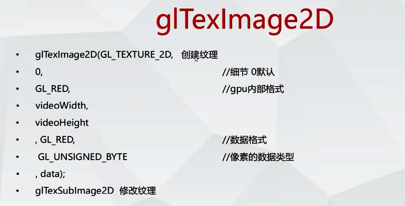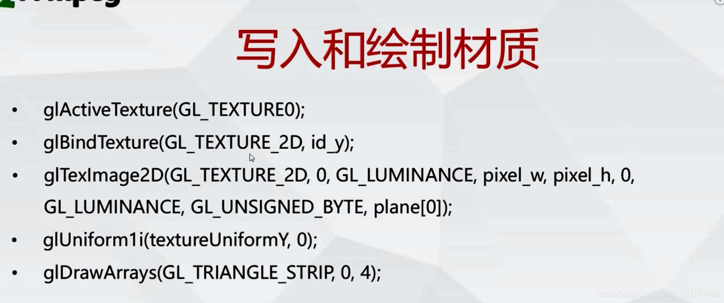 {if (feof(fp)){fseek(fp, 0, SEEK_SET);}fread(datas[0], 1, width*height, fp);fread(datas[1], 1, width*height / 4, fp);fread(datas[2], 1, width*height / 4, fp);glActiveTexture(GL_TEXTURE0);//激活第0层glBindTexture(GL_TEXTURE_2D, texs[0]); //0层绑定到Y材质//修改材质内容(复制内存内容)glTexSubImage2D(GL_TEXTURE_2D, 0, 0, 0, width, height, GL_RED, GL_UNSIGNED_BYTE, datas[0]);//与shader uni遍历关联glUniform1i(unis[0], 0);//0表示对应0层glActiveTexture(GL_TEXTURE0 + 1);glBindTexture(GL_TEXTURE_2D, texs[1]); //1层绑定到U材质//修改材质内容(复制内存内容)glTexSubImage2D(GL_TEXTURE_2D, 0, 0, 0, width / 2, height / 2, GL_RED, GL_UNSIGNED_BYTE, datas[1]);//与shader uni遍历关联glUniform1i(unis[1], 1);glActiveTexture(GL_TEXTURE0 + 2);glBindTexture(GL_TEXTURE_2D, texs[2]); //2层绑定到V材质//修改材质内容(复制内存内容)glTexSubImage2D(GL_TEXTURE_2D, 0, 0, 0, width / 2, height / 2, GL_RED, GL_UNSIGNED_BYTE, datas[2]);//与shader uni遍历关联glUniform1i(unis[2], 2);glDrawArrays(GL_TRIANGLE_STRIP, 0, 4);qDebug() << "paintGL";