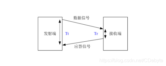 接下来简要介绍time-of-flight测距方法,该方法属于双向测距技术,利用数据信号在一对收发机之间往返的飞行时间来测量两点间的距离。将发射端发出数据信号和接收到接收端应答信号的时间间隔记为Tt,接收端收到发射端的数据信号和发出应答信号的时间间隔记为Tr,如下图所示。信号在这对收发机之间的单向飞行时间Tf=(Tt-Tr)/2,则两点间的距离d=c*Tf,其中c表示电磁波传播速度。