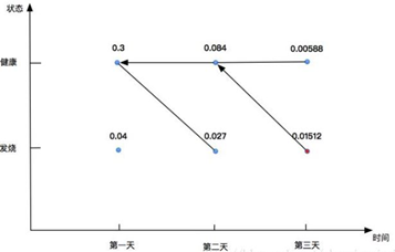 同样的在0.027这个路径上,第二天为发烧B时,第一天也是健康A的。