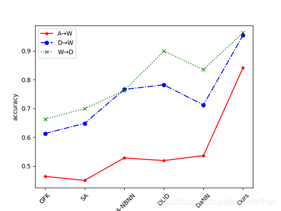 y_3 = [0.663, 0.699, 0.762, 0.899, 0.835, 0.963]plt.plot(x, y_1, color = 'red', marker = '*', linestyle = '-', label = 'A→W')