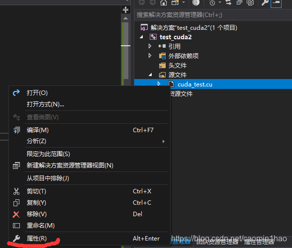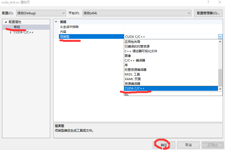 3.4 右击cuda_test.cu文件→属性→配置属性→常规→项类型→CUDA C/C++