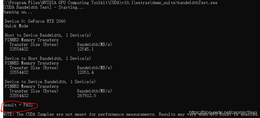 2.5.3 找到C:\Program Files\NVIDIA GPU Computing Toolkit\CUDA\v10.1\extras\demo_suite目录下的bandwidthTest.exe,在 cmd里输入:bandwidthTest.exe