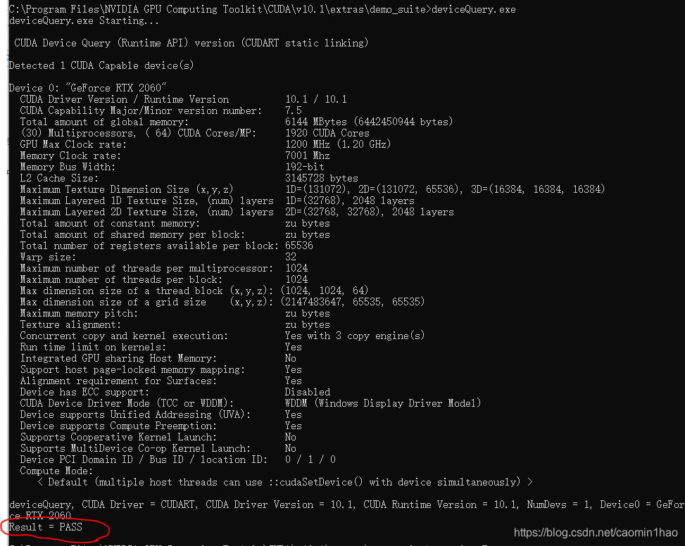 2.5.2 找到C:\Program Files\NVIDIA GPU Computing Toolkit\CUDA\v10.1\extras\demo_suite目录下的deviceQuery.exe,在 cmd里输入:deviceQuery.exe