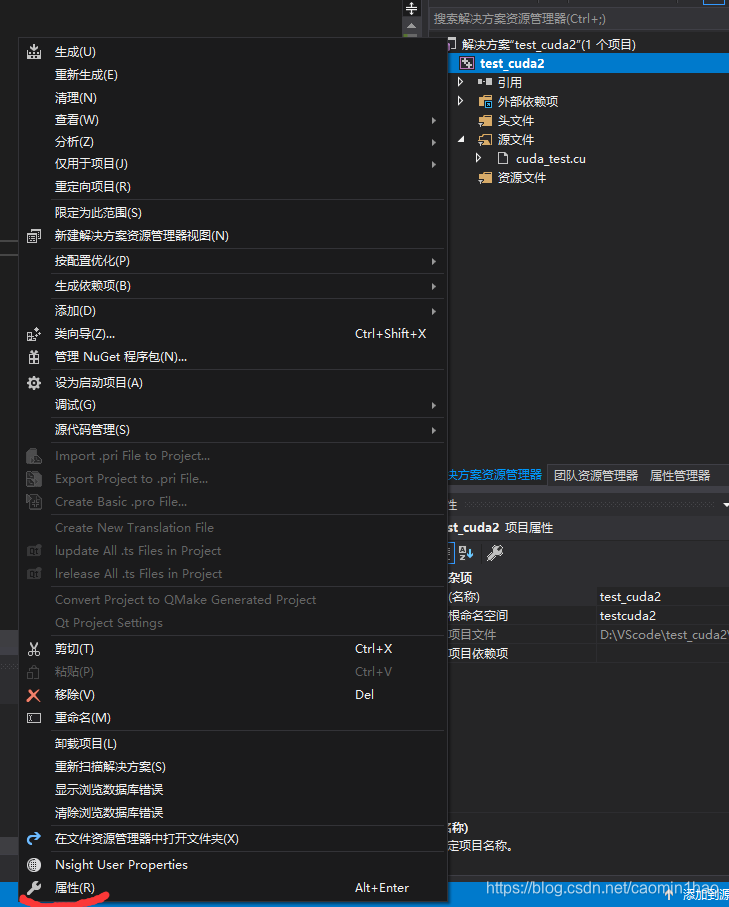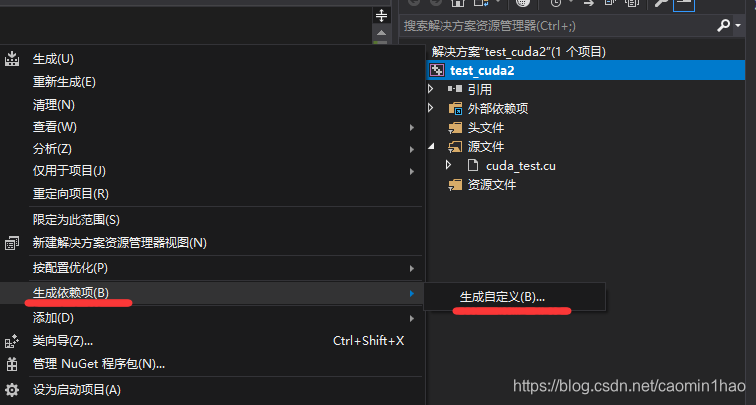 3.3 右击项目名称test_cuda2→生成依赖项→生成自定义,→选择CUDA10.1→确定