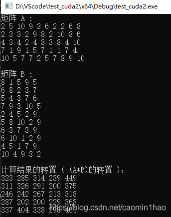 {// 定义状态变量 cublasStatus_t status;// 在 内存 中为将要计算的矩阵开辟空间 float *h_A = (float*)malloc(N*M * sizeof(float));float *h_B = (float*)malloc(N*M * sizeof(float));// 在 内存 中为将要存放运算结果的矩阵开辟空间 float *h_C = (float*)malloc(M*M * sizeof(float));// 为待运算矩阵的元素赋予 0-10 范围内的随机数 for (int i = 0; i < N*M; i++) {h_A[i] = (float)(rand() % 10 + 1);h_B[i] = (float)(rand() % 10 + 1);}// 打印待测试的矩阵 cout << "矩阵 A :" << endl;for (int i = 0; i < N*M; i++) {cout << h_A[i] << " ";if ((i + 1) % N == 0) cout << endl;}cout << endl;cout << "矩阵 B :" << endl;for (int i = 0; i < N*M; i++) {cout << h_B[i] << " ";if ((i + 1) % M == 0) cout << endl;}cout << endl;/*** GPU 计算矩阵相乘*/// 创建并初始化 CUBLAS 库对象 cublasHandle_t handle;status = cublasCreate(&handle);if (status != CUBLAS_STATUS_SUCCESS){if (status == CUBLAS_STATUS_NOT_INITIALIZED) {cout << "CUBLAS 对象实例化出错" << endl;}getchar();return EXIT_FAILURE;}float *d_A, *d_B, *d_C;// 在 显存 中为将要计算的矩阵开辟空间 cudaMalloc((void**)&d_A, // 指向开辟的空间的指针 N*M * sizeof(float) // 需要开辟空间的字节数 );cudaMalloc((void**)&d_B,N*M * sizeof(float));// 在 显存 中为将要存放运算结果的矩阵开辟空间 cudaMalloc((void**)&d_C,M*M * sizeof(float));// 将矩阵数据传递进 显存 中已经开辟好了的空间 cublasSetVector(N*M, // 要存入显存的元素个数 sizeof(float), // 每个元素大小 h_A, // 主机端起始地址 1, // 连续元素之间的存储间隔 d_A, // GPU 端起始地址 1 // 连续元素之间的存储间隔 );cublasSetVector(N*M,sizeof(float),h_B,1,d_B,1);// 同步函数 cudaThreadSynchronize();// 传递进矩阵相乘函数中的参数,具体含义请参考函数手册。 float a = 1; float b = 0;// 矩阵相乘。该函数必然将数组解析成列优先数组 cublasSgemm(handle, // blas 库对象 CUBLAS_OP_T, // 矩阵 A 属性参数 CUBLAS_OP_T, // 矩阵 B 属性参数 M, // A, C 的行数 M, // B, C 的列数 N, // A 的列数和 B 的行数 &a, // 运算式的 α 值 d_A, // A 在显存中的地址 N, // lda d_B, // B 在显存中的地址 M, // ldb &b, // 运算式的 β 值 d_C, // C 在显存中的地址(结果矩阵) M // ldc );// 同步函数 cudaThreadSynchronize();// 从 显存 中取出运算结果至 内存中去 cublasGetVector(M*M, // 要取出元素的个数 sizeof(float), // 每个元素大小 d_C, // GPU 端起始地址 1, // 连续元素之间的存储间隔 h_C, // 主机端起始地址 1 // 连续元素之间的存储间隔 );// 打印运算结果 cout << "计算结果的转置 ( (A*B)的转置 ):" << endl;for (int i = 0; i < M*M; i++) {cout << h_C[i] << " ";if ((i + 1) % M == 0) cout << endl;}// 清理掉使用过的内存 free(h_A);free(h_B);free(h_C);cudaFree(d_A);cudaFree(d_B);cudaFree(d_C);// 释放 CUBLAS 库对象 cublasDestroy(handle);getchar();return 0;