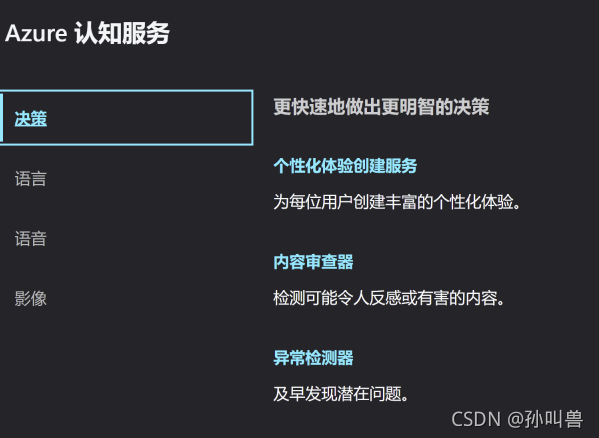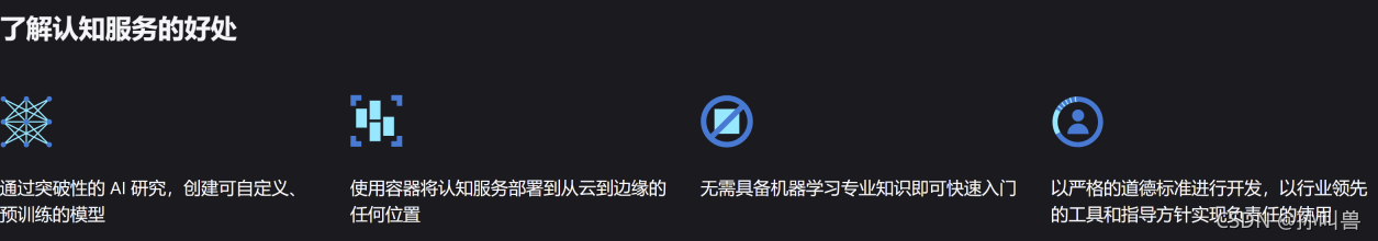 认知服务使每位开发人员无需具备机器学习的专业知识就能接触到 AI。只需要一个 API 调用,就可以将看、听、说、搜索、理解和加速决策的能力嵌入到应用中。让所有技能水平的开发人员都能轻松在其应用中添加 AI 功能。